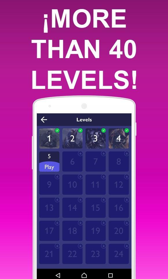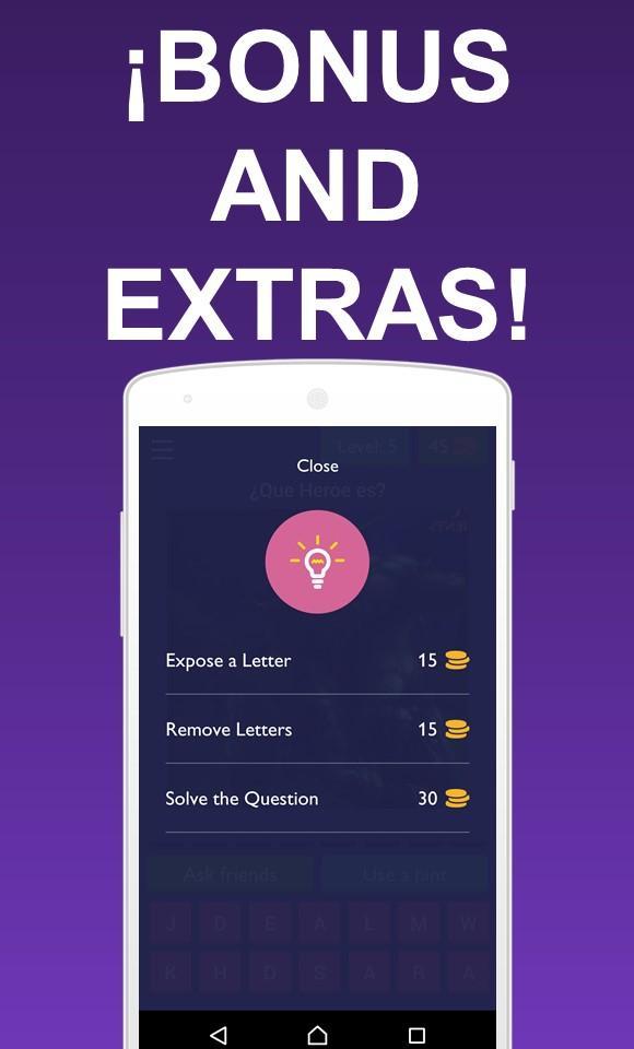 تحتوي اللعبة على أكثر من 40 مستوى ، في كل واحد يتم عرض صورة مع أيقونة أو شكل بطل معين ، فقط مع هذا المسار ، سيتعين عليك تخمين الاسم الكامل للبطل ، إذا ضربت وانتقلت إلى المستوى التالي ، فستتلقى أيضًا المكافآت والإضافات.